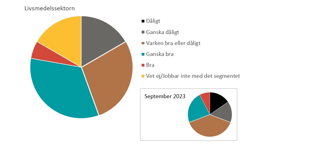 Jämfört med den dystra bilden av läget för ett halvår sedan är trenden positivare nu, även om bilden är splittrad och den rådande konjunkturen fortsatt bedöms som övervägande ganska dålig. Livsmedel är den sektor som bedöms må bäst, följd av industrin, medan e-handeln och konsumentvarumarknaden bedöms ha det tyngre.